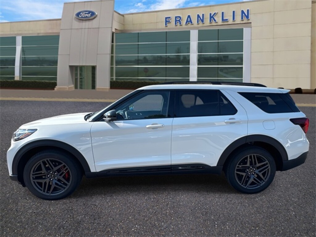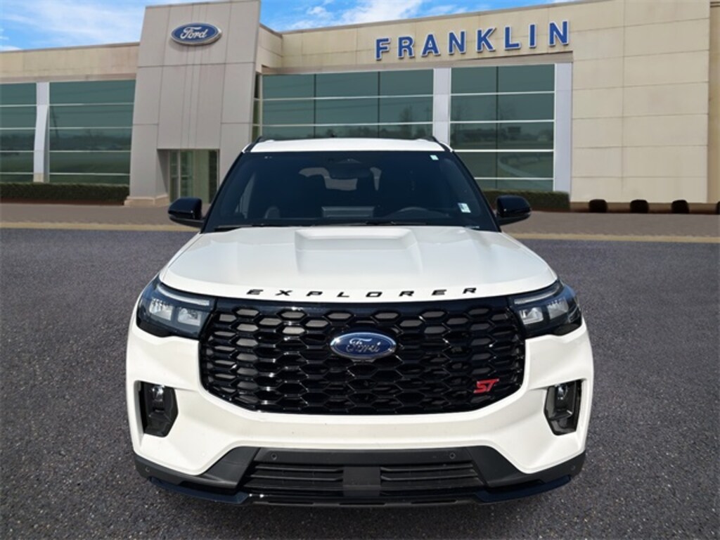THIS VEHICLE INCLUDES THE FOLLOWING FEATURES AND OPTIONS: Equipment Group 400A Standard Package, Sun and Sound Package (B&O Sound System by Bang & Olufsen, Multicontour Seats w/Front Active Motion, and Panoramic Vista Roof w/Power Shade), Explorer ST, 4D Sport Utility, 3.0L EcoBoost V6, 10-Speed Automatic, 4WD, Star White Metallic Tri-Coat, Onyx w/Heated/Ventilated Miko Sport Captain's Chairs, Navigation System, Power Liftgate, 10 Speakers, 3.58 Non-Limited Slip Rear Axle, 3rd row seats: bench, 4-Wheel Disc Brakes, ABS brakes, Air Conditioning, Alloy wheels, AM/FM radio: SiriusXM with 360L, Apple CarPlay/Android Auto, Auto High-beam Headlights, Auto-dimming door mirrors, Auto-dimming Rear-View mirror, Automatic temperature control, Brake assist, Bumpers: body-color, Compass, Delay-off headlights, Driver door bin, Driver vanity mirror, Dual front impact airbags, Dual front side impact airbags, Electronic Stability Control, Emergency communication system: 911 Assist, Exterior Parking Camera Rear, Ford BlueCruise Equipped (1-Year Plan), Four wheel independent suspension, Front anti-roll bar, Front Bucket Seats, Front Center Armrest, Front dual zone A/C, Front fog lights, Front reading lights, Fully automatic headlights, Garage door transmitter, Heated door mirrors, Heated front seats, Heated rear seats, Heated steering wheel, Heated/Ventilated Miko Sport Captain's Chairs, Illuminated entry, Knee airbag, Leather steering wheel, Low tire pressure warning, Memory seat, Occupant sensing airbag, Outside temperature display, Overhead airbag, Overhead console, Panic alarm, Passenger door bin, Passenger vanity mirror, Power door mirrors, Power driver seat, Power passenger seat, Power steering, Power windows, Radio: B&O Sound System by Bang & Olufsen, Rain sensing wipers, Rear air conditioning, Rear anti-roll bar, Rear reading lights, Rear window defroster, Rear window wiper, Remote keyless entry, Security system, Speed control, Speed-sensing steering, Speed-Sensitive Wipers, Split folding rear seat, Spoiler, Sport steering wheel, Steering wheel mounted audio controls, Tachometer, Telescoping steering wheel, Tilt steering wheel, Traction control, Trip computer, Turn signal indicator mirrors, Variably intermittent wipers, Ventilated front seats, and Wheels: 21" Magnetite-Painted Aluminum.