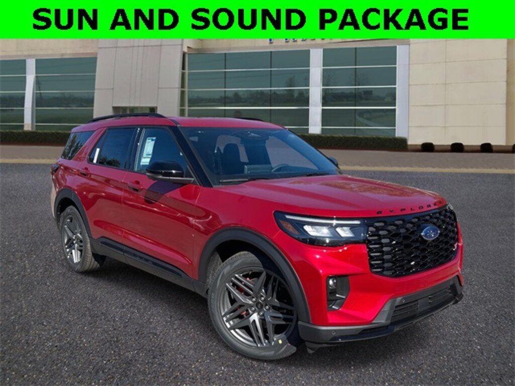 THIS VEHICLE INCLUDES THE FOLLOWING FEATURES AND OPTIONS: Equipment Group 400A Standard Package, Sun and Sound Package (B&O Sound System by Bang & Olufsen, Multicontour Seats w/Front Active Motion, and Panoramic Vista Roof w/Power Shade), Explorer ST, 4D Sport Utility, 3.0L EcoBoost V6, 10-Speed Automatic, 4WD, Rapid Red Metallic Tinted Clearcoat, Onyx w/Heated/Ventilated Miko Sport Captain's Chairs, Exterior Parking Camera Rear, Navigation System, Power Liftgate, 10 Speakers, 3.58 Non-Limited Slip Rear Axle, 3rd row seats: bench, 4-Wheel Disc Brakes, ABS brakes, Air Conditioning, Alloy wheels, AM/FM radio: SiriusXM with 360L, Apple CarPlay/Android Auto, Auto High-beam Headlights, Auto-dimming door mirrors, Auto-dimming Rear-View mirror, Automatic temperature control, Brake assist, Bumpers: body-color, Compass, Delay-off headlights, Driver door bin, Driver vanity mirror, Dual front impact airbags, Dual front side impact airbags, Electronic Stability Control, Emergency communication system: 911 Assist, Ford BlueCruise Equipped (1-Year Plan), Four wheel independent suspension, Front anti-roll bar, Front Bucket Seats, Front Center Armrest, Front dual zone A/C, Front fog lights, Front reading lights, Fully automatic headlights, Garage door transmitter, Heated door mirrors, Heated front seats, Heated rear seats, Heated steering wheel, Heated/Ventilated Miko Sport Captain's Chairs, Illuminated entry, Knee airbag, Leather steering wheel, Low tire pressure warning, Memory seat, Occupant sensing airbag, Outside temperature display, Overhead airbag, Overhead console, Panic alarm, Passenger door bin, Passenger vanity mirror, Power door mirrors, Power driver seat, Power passenger seat, Power steering, Power windows, Radio: B&O Sound System by Bang & Olufsen, Rain sensing wipers, Rear air conditioning, Rear anti-roll bar, Rear reading lights, Rear window defroster, Rear window wiper, Remote keyless entry, Security system, Speed control, Speed-sensing steering, Speed-Sensitive Wipers, Split folding rear seat, Spoiler, Sport steering wheel, Steering wheel mounted audio controls, Tachometer, Telescoping steering wheel, Tilt steering wheel, Traction control, Trip computer, Turn signal indicator mirrors, Variably intermittent wipers, Ventilated front seats, and Wheels: 21" Magnetite-Painted Aluminum.